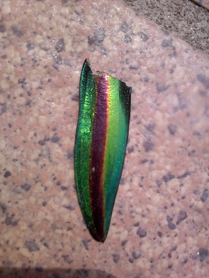 たぶんカミキリムシのたぐいの羽。だと思うよ。玉虫色。