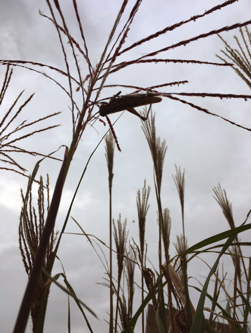 逆さバッタと曇空