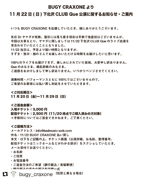 11/22は3人でお届けしたいと思います。100%のライブをお届けできず、楽しみにされていた皆様、大変申し訳ありません。Queの皆様、錯乱前戦の皆様、ご迷惑をおかけし申し訳ありません、いつかリベンジさせてください。
