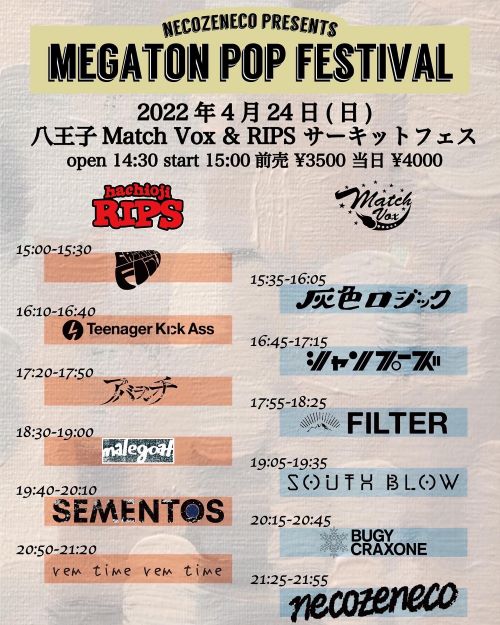 necozenecoにお呼ばれした「MEGATON POP FESTIVAL」のタイムテーブルが発表されました!1枚目は2019年の対バン時のパシャリ。今回もSunn対決になるのかな?!そしてはじめての八王子、たのしみすぎる。でもひさしく行けてない八王子ラーメン「五右衛門」は西八王子だから遠いのかなぁ。。
